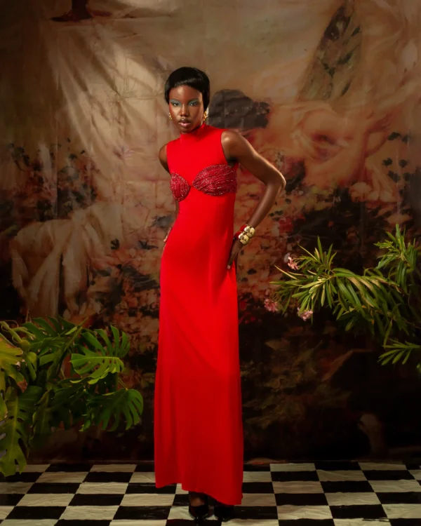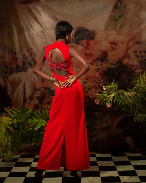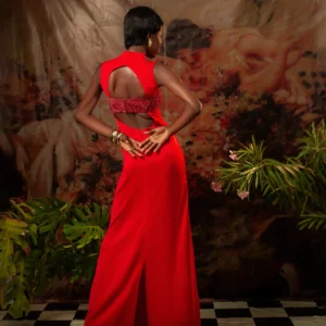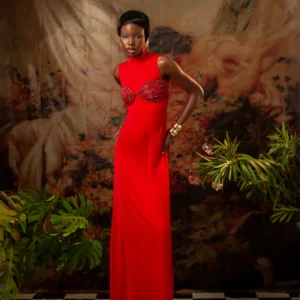 Red Hand Embroidered Column Dress