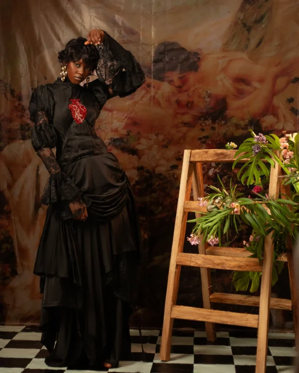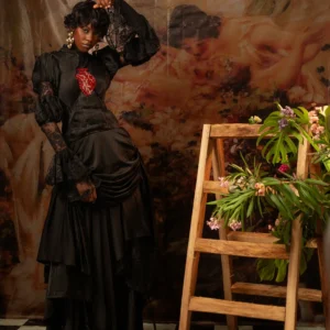 Full pleated silk bodice with inbuilt corset and layered skirt and hand embroidered heart motif with exaggerated french lace bell sleeve